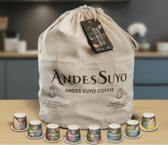 Origen Andessuyo: 100% orgánico, de comercio justo. Variedades de Espresso y Lungo, con granos de Perú y Latinoamérica.