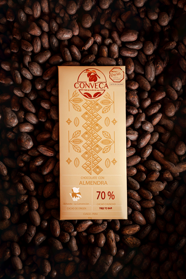 Tableta de chocolate 70% cacao chuncho, almendras, azúcar orgánica y manteca de cacao.