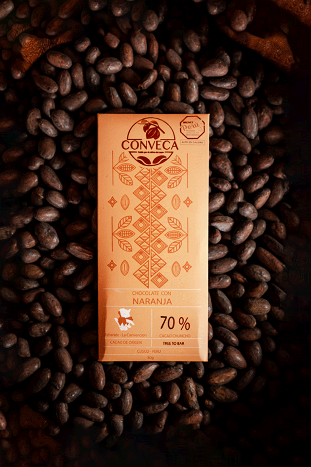 Tableta de chocolate 70% cacao chuncho, naranja deshidratada, azúcar orgánica y manteca de cacao.
