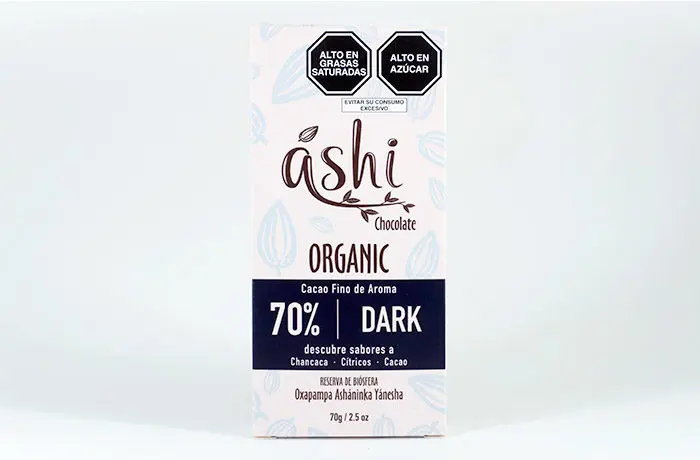 Tableta de chocolate 70% cacao chuncho, con muña, azúcar orgánica y manteca de cacao.