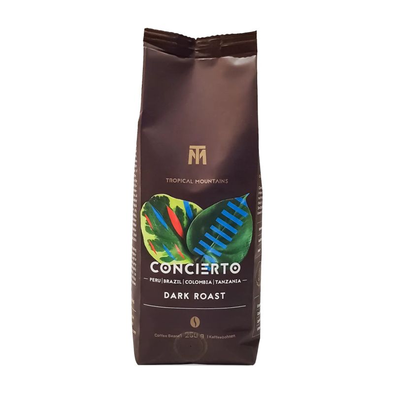 Concierto de Tropical Mountains es una mezcla de café orgánico con predominancia de Arabica de Perú, Colombia y Brasil y Robusta de Tanzania, ofreciendo un sabor armonioso con notas de nuez moscada y cedro. Esta mezcla apoya a los agricultores locales mediante comercio justo y compra directa, asegurando calidad y sostenibilidad en cada taza.