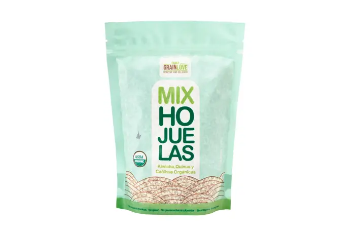 Hojuelas de maíz morado, quinua, yacón y cacao nibs prebióticas.