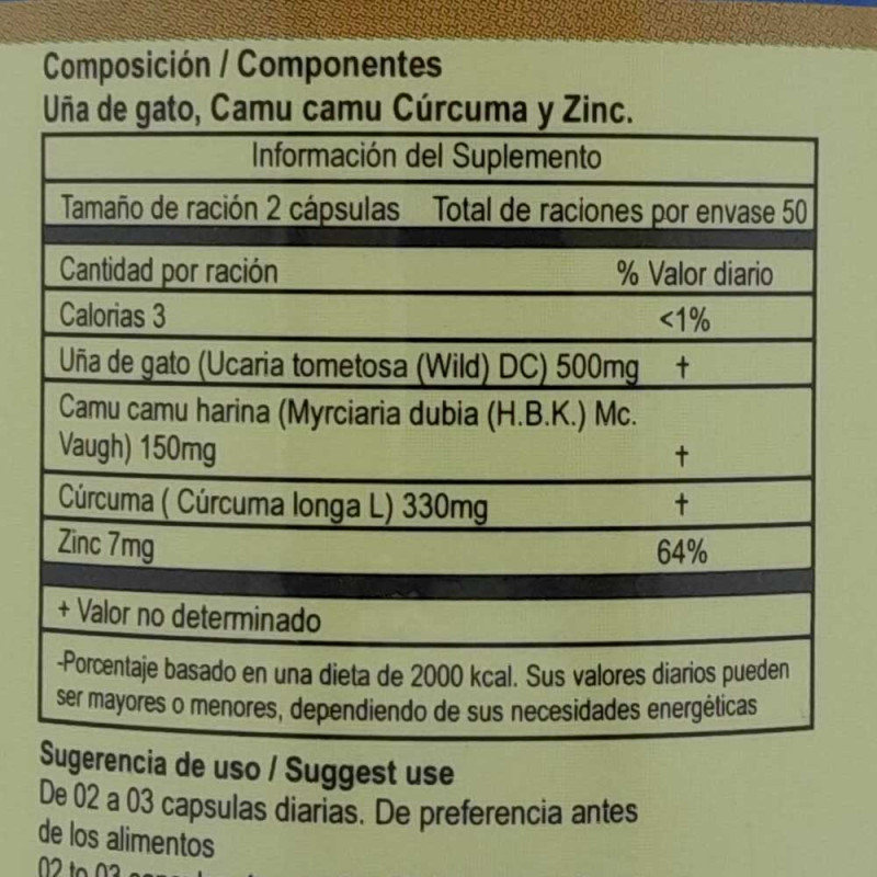 * Uña de Gato (500 mg): Reconocida por sus propiedades antiinflamatorias y su apoyo al sistema inmunológico.